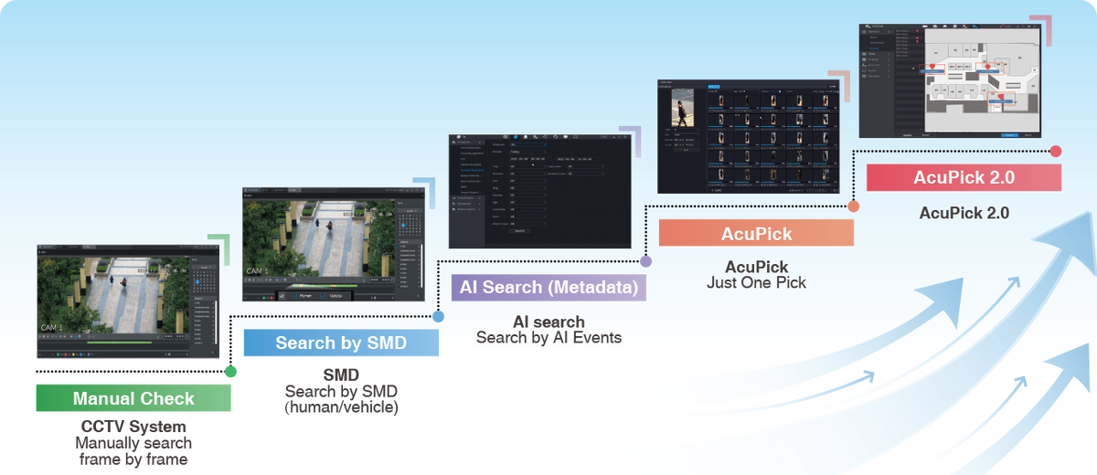 AcuPick 2.0 может быть одновременно включен с распознаванием лиц на NVR5-XI или NVR6-XI. Когда обе функции активны, лица, проявляющие подозрительное поведение, могут быть идентифицированы и отслежены. Если такой человек повторно входит в помещение, система точно оповещает персонал службы безопасности с помощью распознавания лиц, эффективно повышая безопасность.