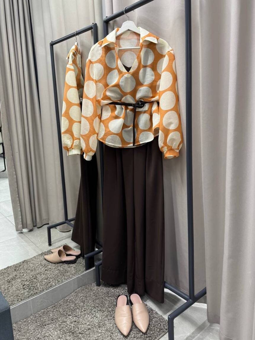 Еще одно беспроигрышное сочетание: шоколадный + охра 🤎🧡 Широкие брюки в сочетании с воздушной блузой с принтом «крупный горох» Вторым слоем под блузу добавляем топ в цвет брюк и небольшой акцент в видео тонкого ремешка, чтобы подчеркнуть линию талии 👌🏽