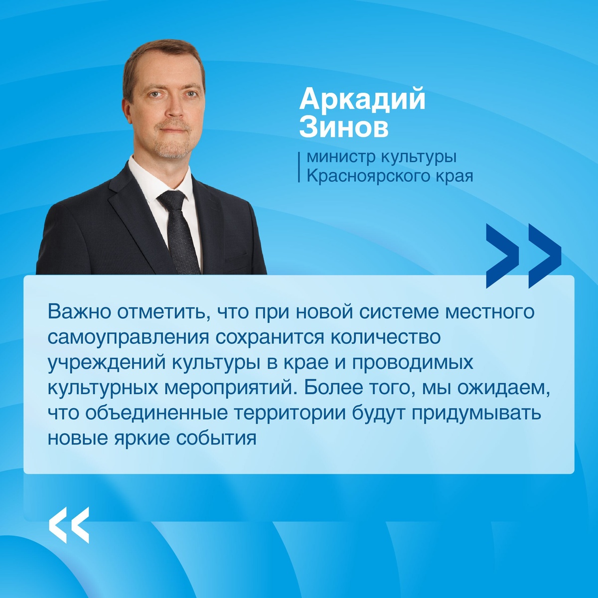 В крае принят закон о новой системе местного самоуправления. Согласно документу, в Красноярском крае появятся 39 муниципальных образований: 6 — городских и 33 — муниципальных. В министерстве культуры пояснили, на работе ведомства эти изменения никак не отразятся. «Изменения в системе местного самоуправления укрепят работу по основным инфраструктурным и кадровым направлениям отрасли: продолжатся работы по капитальным ремонтам и обновлению материально-технической базы учреждений культуры, обучению и повышению квалификации наших работников, а также привлечению молодых талантливых специалистов в культуру края», — рассказал министр культуры Красноярского края Аркадий Зинов. Это касается и других социальных ведомств.