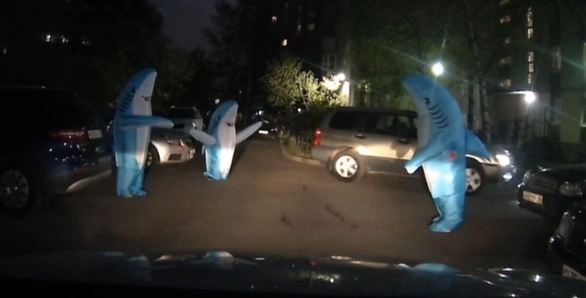 В Петербурге в одном из дворов жилого дома заметили «акул». Конечно, не настоящих. Это были люди в костюмах грозных морских хищников.