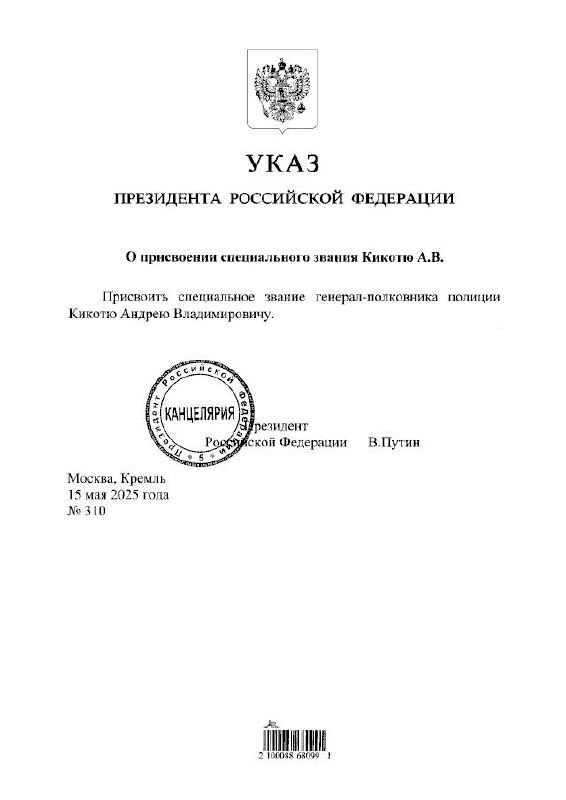 Андрей Кикоть, руководитель службы по вопросам гражданства и регистрации иностранных граждан МВД и первый заместитель главы ведомства, получил новое специальное звание - генерал-полковник полиции. Это важное событие было отмечено президентским указом, который был официально опубликован 15 мая на портале правовых актов.