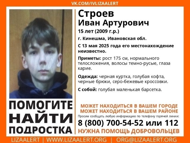 В Ивановской области разыскивают 15-летнего подростка, пропавшего 13 мая Поисковый отряд «ЛизаАлерт» просит жителей Ивановской области помочь в поисках 15-летнего Ивана Строева. Подросток пропал 13 мая в Кинешме. Приметы: рост 175 см, нормального телосложения, волосы темно-русые, глаза карие. Был одет в черную куртку, голубую кофту, черные брюки, серо-бежевые кроссовки. С собой была голубая маленькая барсетка. Всех, кто видел Ивана Строева или располагает какой-либо информацией о его местонахождении, просят звонить по телефонам: 8 800 700 54 52 или 112.