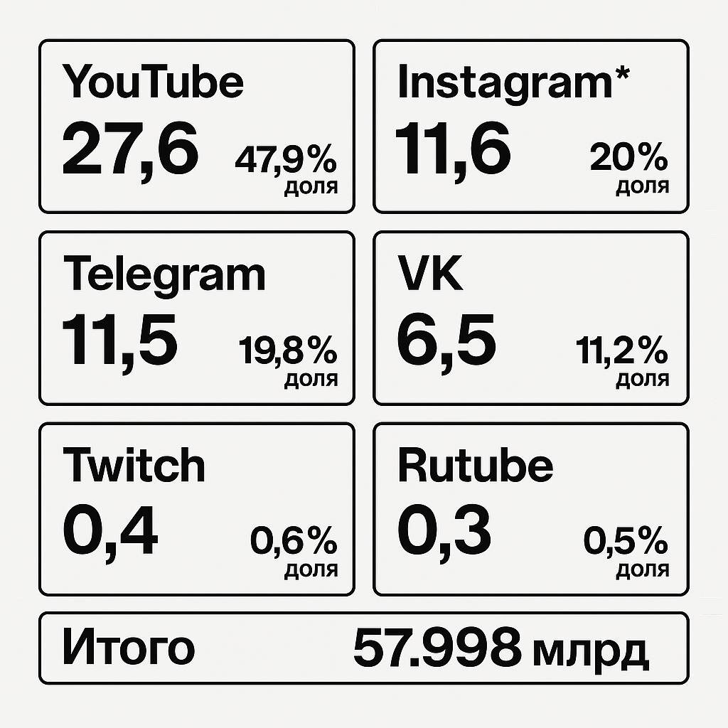 💶 КУДА СЕЙЧАС УХОДЯТ РЕКЛАМНЫЕ ДЕНЬГИ? Рынок инфлюенс-маркетинга в России в 2024 году — 58 млрд рублей. Из них почти 28 млрд ушло на YouTube, 12 млрд — в нельзяграм, 11,5 млрд — в Telegram. С сентября реклама в нельзяграм официально под запретом. Казалось бы, бюджеты должны перейти в Telegram. Но этого не происходит. Ни у себя в канале, ни у коллег, ни на биржах я не вижу роста. Telegram пока не воспринимается как стабильная рекламная платформа. Бренды осторожничают, агентства выжидают. YouTube, хоть и лидер, не показывает роста — просмотры падают, а продакшн дорогой. TikTok в тени, RuTube получил 300 млн рублей, но как и зачем — непонятно. Рекламные бюджеты зависли. Все ждут понятных, прозрачных и эффективных решений. Кто первым предложит внятную механику продвижения в Telegram — тот и соберёт освободившиеся миллиарды. 🔒 Могу сказать только одно: поживём — увидим.