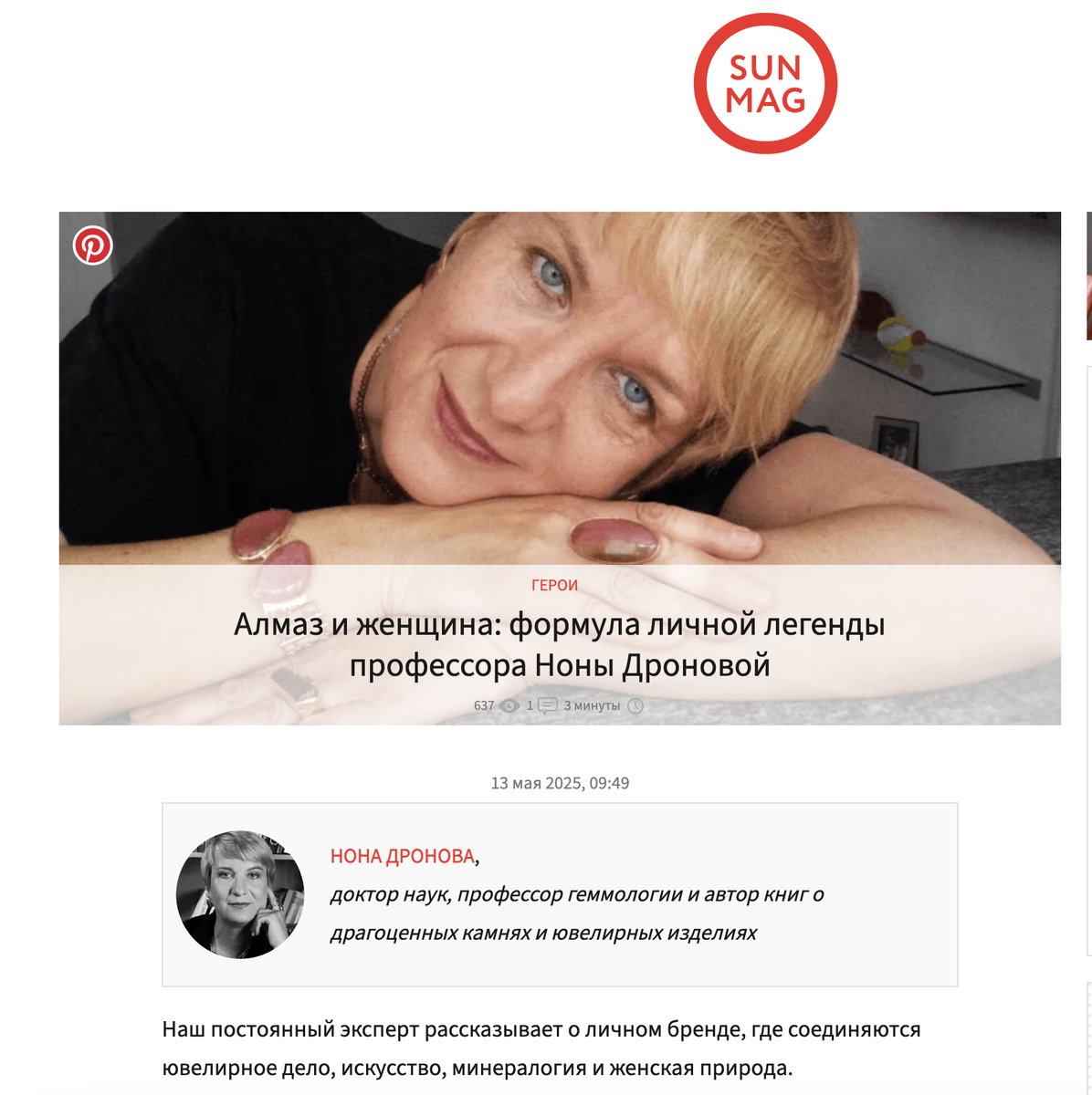 Журнал САНМАГ (медіахолдинг САНЛАЙТа) опубликовал знаковое интервью с Ноной Дроновой о ее взглядах на ювелирный рынок, преодоление трудностей и про ее коллекцию антиквариата.