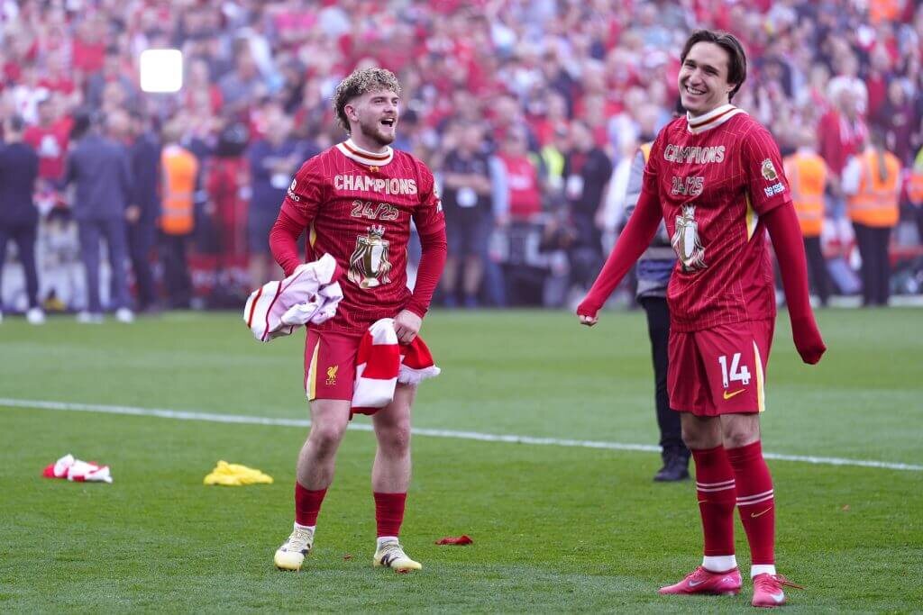 Кьеза празднует на поле «Энфилда» после того, как «Ливерпуль» стал чемпионом (Питер Бирн/PA Images via Getty Images)