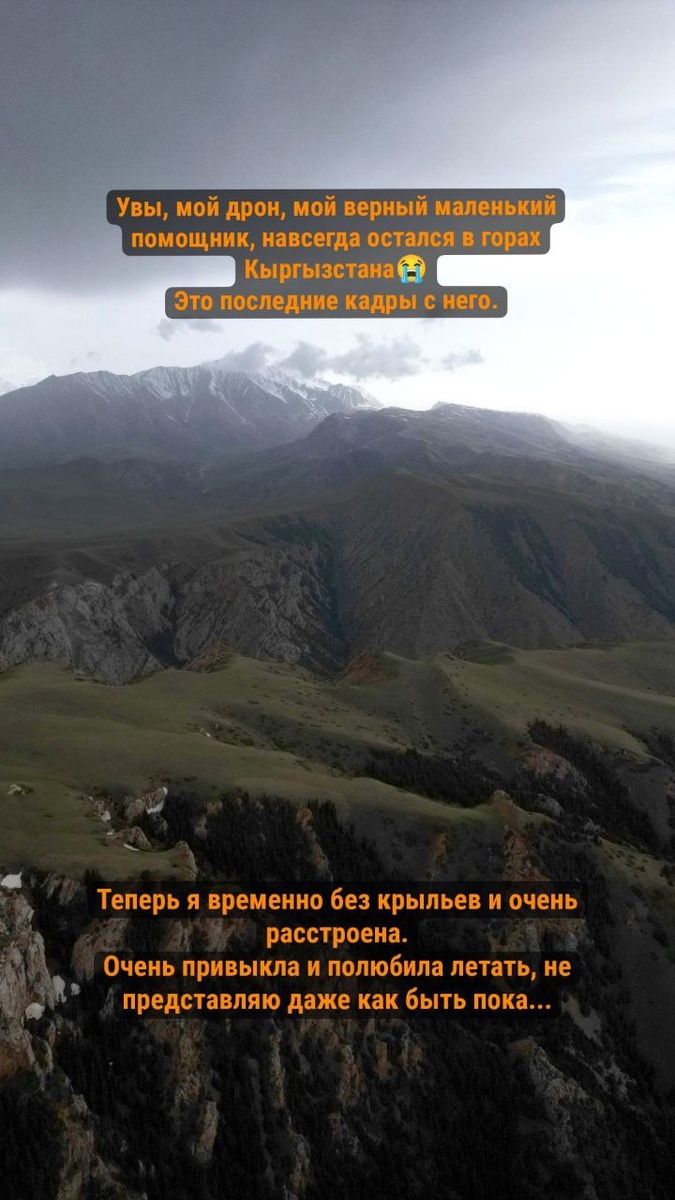 Я временно без дрона, увы. Просадка мощности аккумулятора резкая процентов на 5-7, пошел вниз принудительно и отрубилась связь в скалах, не восстановилась. Искали несколько часов вечером и утром, проверили все ущелья с воздуха и с земли, скатился скорее всего в расщелину или на ледник. Глазами не нашли😭 У дрона которым искали в этом же месте тоже связь посыпалась, благо вывели сразу верх. Расстроена жутко, не представляю, как без дрона сейчас. Что же, зато вопрос с тем, что хочу на день рождения точно решен. Эх, я хотела докупить более мощный дрон, но точно не таким образом.