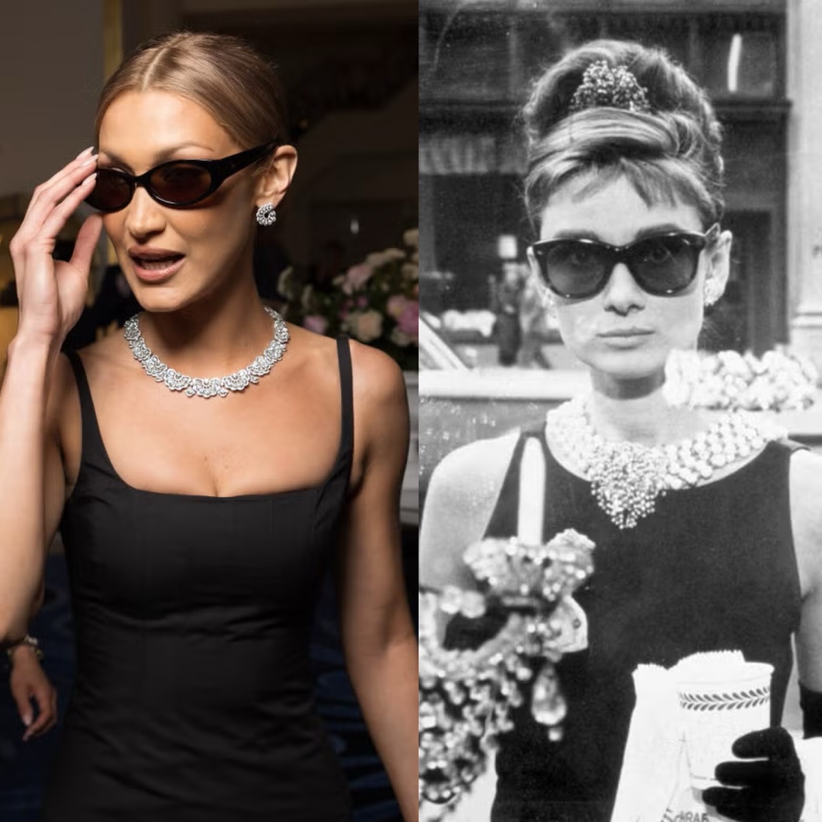 У Одри Хепбёрн в «Завтраке у Тиффани» был похожий силуэт: чёрное платье без рукавов, оперные перчатки, очки, жемчуг и высокая причёска. Белла убрала лишнее и оставила суть — изящество, лёгкость и силу в простоте. Если Хепбёрн воплощала иронию и загадку, Белла — современную уверенность.