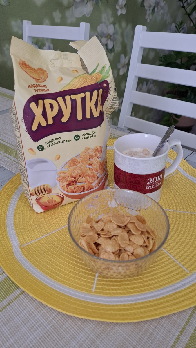 Мммм, обожаю кукурузные хлопья! Любые: сладкие, не сладкие. На нашем обеденном столе почти всегда можно увидеть пачку кукурузных хлопьев. И это в основном мое лакомство. Не знаю, правильно это или не правильно, вредно или полезно... Но если учесть, что купленная пачка задерживается на долго, то вполне себе и ничего страшного. Просто так я их ем очень редко, ну если только к чаю дома ничего не оказалось. А в основном они у меня идут, как дополнение к чему- то. На упаковке в инструкции по применению можно найти рекомендации употреблять с молоком, как вкусный завтрак. Я же предпочитаю с кефиром или, еще лучше, ряженкой. Наливаю в бокал ряженки, насыпаю побольше хлопьев, хорошо перемешиваю, даю минуту постоять, набухнуть, размягчиться и с огромным удовольствием уплетаю за обе щеки. Получается такой вкусный освежающий и полезный перекус. Это блюдо номер один. А второе блюдо- лакомство. Люблю мороженое с хлопьями. Придумала сама, ни где не слышала. Покупаю брикет шоколадного пломбира, клад