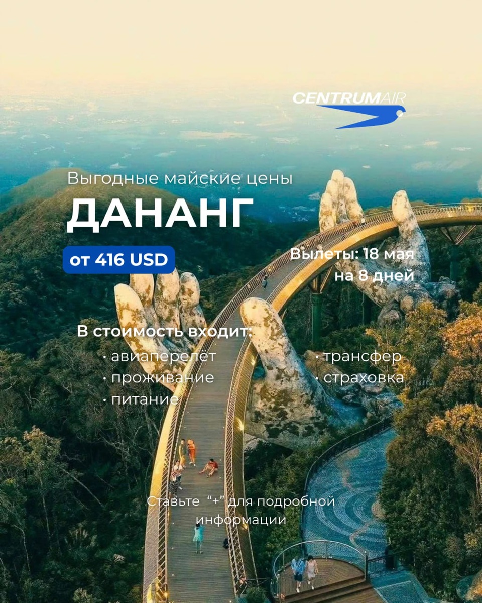 🇻🇳 Дананг – город, где бескрайние и широкие пляжи встречаются с живописными горами, а древние храмы соседствуют с современными развлечениями. 🗓Вылет: 18.05 — 25.05.2025, на 7 ночей/8 дней, на борту а/к Centrum Air😎 ⭐️ Alani Hotel & Spa Da Nang 3*, 416 USD ⭐️ Cicilia Hotels & Spa Danang 4*, 502 USD ⭐️ Wink Hotel Danang Riverside 5*, 581 USD ⭐️ Tms Hotel Da Nang Beach 5*, 836 USD ⭐️ Four Points By Sheraton Da Nang 5*, 892 USD ⭐️ Wyndham Hoi An Royal Beachfront Resort & Villas 5*, 959 USD ⭐️ Vinpearl Resort & Golf Nam Hoi An 5*, 1017 USD ⭐️ Da Nang Marriott Resort And Spa, Non Nuoc Beach Villas 5*, 1685 USD 📌Стоимость указана на одного человека при двухместном размещении и актуальна на момент публикации 🌐Наш сайт для бронирования ⚡️ Умный бот для подбора туров Наши контакты : https://taplink.cc/gidtraveluz +998 93-322-75-77 +998 77-709-33-66