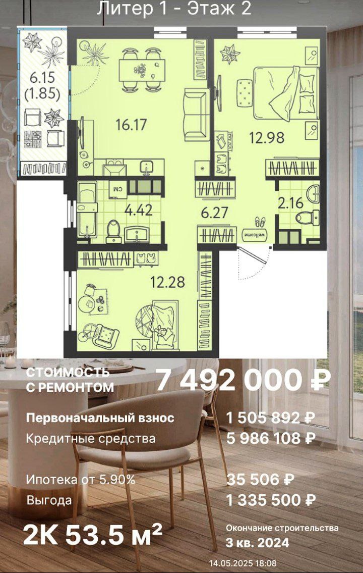 🏢 2-комнатная квартира с ремонтом от застройщика в сданном доме — под семейную ипотеку и с первоначальным взносом всего 1,5 млн рублей.