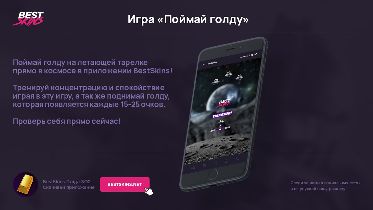 Играй и лови голду BestSkins Голда 🌙 Лови голду на летающей тарелке прямо в космосе и лутай голду! 🚀 Тренируй терпение и настойчивость, присущую про игрокам, а взамен получай приятный бонус в виде голды 👽 ✨ Скачать - https://bestskins.net/