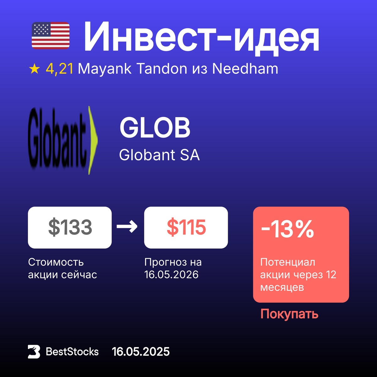 🇺🇸 Инвест-идея по акции Globant SA Тикер: GLOB Прогнозная цена: $115 (-13%) Рекомендация: Покупать InvestRank акции: 4 из 10 Прогноз сделан: 16.05.2025 Прогноз до: 16.05.2026 Инвест-компания: Needham Аналитик: Mayank Tandon Ещё рекомендации на сегодня → ••••• 🎯 Вы знали, что в разделе с криптовалютами можно узнать цены, динамику и ключевые показатели по каждой из доступных криптовалют абсолютно бесплатно?