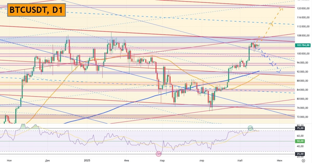 💰📉📈Bitcoin так же не сформировал вчера сигнал на продажу, так как под конец дня цену вновь вернули выше отметки 102200. Как я и предполагал вчера, могут попробовать начать вытягивать цену даже не самыми вау-новостями. Так, за последние 24 часа в СМИ начинают раскручивать поводы и нарративы: - JPMorgan считает, что BTC может превзойти золото по доходности во 2п 2025г - Méliuz стала первой в Бразилии публичной компанией, которая начала покупать BTC на баланс - Китайская публичная компания DDC Enterprise начнет покупать BTC на баланс - Некоторые эксперты утверждают, что BTC уже стал новым стандартом Америки: 49,6 млн американцев владеют BTC против 36,7 млн с золотом - в феврале 2025г Майкл Сэйлор советовал продать почку, но не продавать BTC. В мае Майкл Сэйлор советует также продать зуб, но не продавать BTC Позитивно? Да! Покупка? Точно не шорт!😁 Технически у нас наблюдается консолидация цены в узком диапазоне (или как говорят криптаны: "пружина сжимается"). Только вот прав
