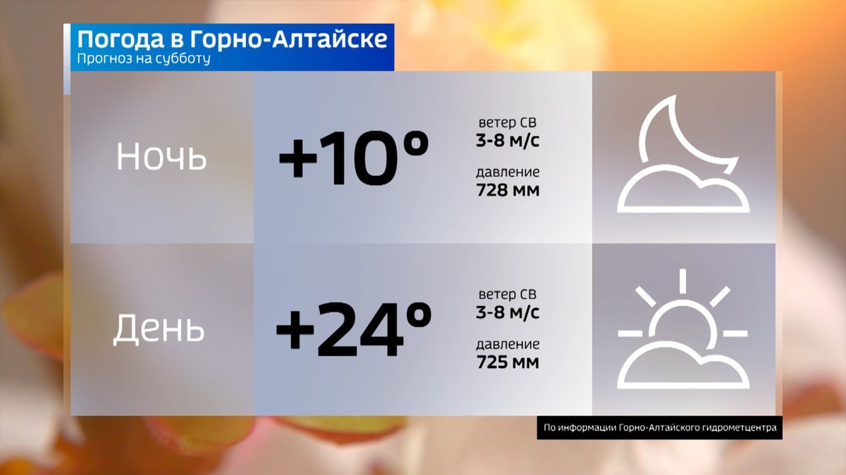 ☀️☀️☀️ Горно-Алтайск: ⛅️Сегодня ночью и завтра днем переменная облачность, преимущественно без осадков, ветер умеренный, Температура воздуха 🌡 ночью плюс 9…11 °С, днем плюс 23…25 °С. По республике: ⛅️Переменная облачность, в отдельных районах кратковременные дожди🌧, грозы, сегодня ночью завтра днем преимущественно без осадков, ветер умеренный, днем местами порывистый до 15 м/с, Температура воздуха 🌡 ночью плюс 7…12 °С, местами плюс 1…6 °С, днем плюс 21…26 °С, в горах плюс 12…17 °С. #погода 👍 Подписывайся на Вести Эл Алтай