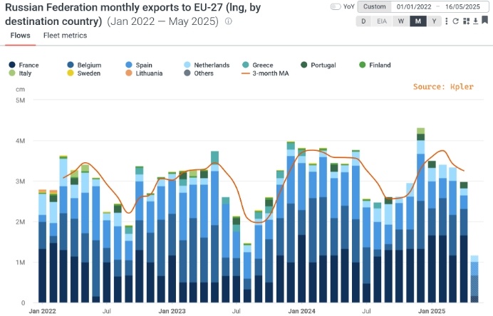 Что касается СПГ, то здесь картина иная. Бельгия, Франция и Испания импортируют большую часть российского СПГ, поступающего в Европу, и могут с лёгкостью заменить его другими поставками из других источников, например из США, на что ЕС оказывает давление президент Дональд Трамп.