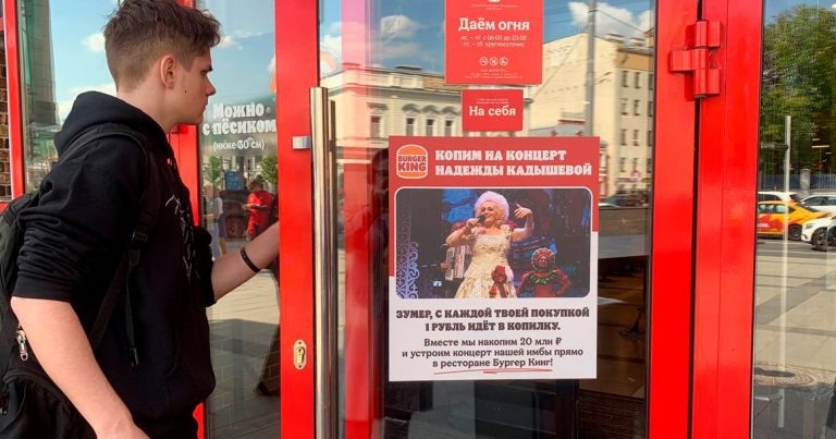 После завирусившихся тиктоков Надежда Кадышева неожиданно стала самой высокооплачиваемой артисткой в России. Пока все изучают феномен Кадышевой, «Бургер Кинг» решил пригласить певицу выступить прямо в одной из своих закусочных. Сегодня по телеграм-каналам разлетелось объявление, наклеенное на дверь одного из «Бургер Кингов», где сказано, что для концерта нужно собрать 20 млн рублей. Метят в основную аудиторию Кадышевой — зумеров. «С каждой твоей покупкой 1 рубль идет в копилку. Вместе мы накопим 20 млн рублей и устроим концерт нашей имбы прямо в ресторане!» — сообщает объявление. Как выяснил «Москвич Mag», наклейка появилась на двери ресторана недалеко от метро «Баррикадная». Не возле зоопарка, а с другой стороны — на Садовом кольце. «Зумеры, напрягитесь… Ждем концерт завтра», — шутит FOMOTEKA. Вообще в комментариях под постами в соцсетях набралось много недовольных и безобидной акцией пиара, и самим объявлением. «Бумеры пытаются в сленг», «Кринжухи навалили», «Угорают», — пытаются яз