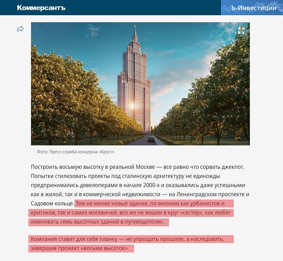 Застройщик «Крост» через статью в «Коммерсанте» объясняет интересующимся, почему именно его жилой комплекс «Высотка на Жукова» в дальнейшем будет считаться восьмой сталинской высоткой. И там же рассказывает, по какой причине проекты «Alcon Tower» и «Триумф Палас» не относятся к статусному уровню знаменитых «семи сестёр». Если коротко: выше указанные проекты «упростили прошлое». А теперь создаваемая архитектура, напротив, унаследовала его. Заявление, конечно, сильное. Однако запущено через пень-колоду. Декларируя подобные вещи не напрямую, а через третьих лиц, ответчик сохраняет себе поле для отступления. Это делается тогда, когда нет уверенности, что заявленный результат будет достигнут в полной мере. Ведь в данном случае фраза «унаследовать прошлое» обязует застройщика выполнить все работы качественно, воспроизвести соответствующую детализацию фасадов и внутренних пространств. Необходимо будет изящно реализовать конструкции шпиля. И даже оконные рамы придётся подобрать так, чтобы