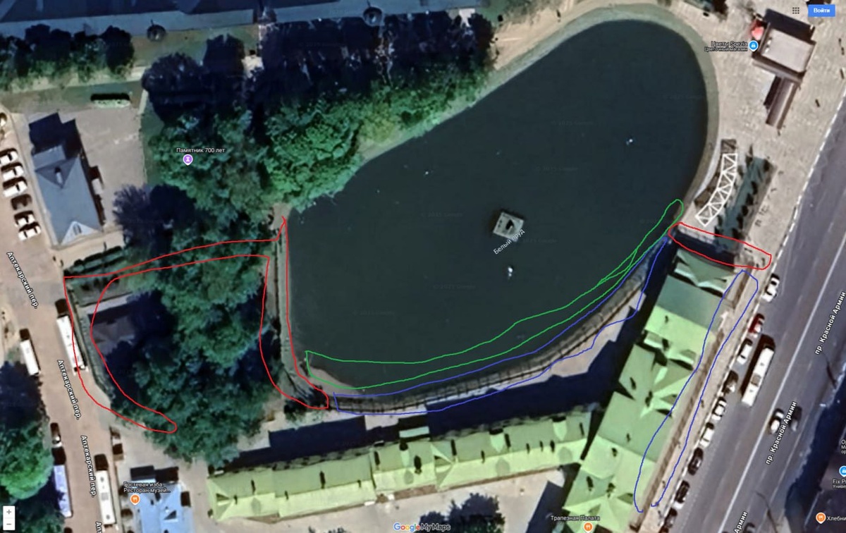 Как я понял, представители лавры готовы убрать забор вокруг скверика между Белым прудом и Уточьей башней, а также часть забора сбоку от качелей, установленных у проспекта Красной Армии (на картинке выше отметил красным). Синим отметил забор, который лавра убрать не хочет, т.к. её представители утверждают, что вдоль пруда забор стоит на подпорной стенке, а вдоль проспекта — на режимном объекте. При этом так называемая подпорная стенка вдоль берега Белого пруда появилась во время строительства новых зданий на территории гостиницы и просто обрезала три метра берега, по которому раньше можно было ходить с колясками в несколько рядов. Сейчас, даже если убрать забор, пройти вокруг пруда можно будет только очень ловким людям с хорошим вестибулярным аппаратом, т. к. в самом узком месте берег со стороны гостиницы не более 30 сантиметров. Еще до прихода Пахомова я предложил представителям лавры насыпать берег так, как он был раньше, чтобы проход был широким, но они мне очень резко ответили, ч