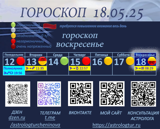 - Напряженный аспект МЕРКУРИЯ с МАРСОМ (кульминация аспекта в воскресенье, 18.05.25, влияние минимум с 17.05.25 по 19.05.25). Этот аспект в целом может принести - проблемы в коммуникации, споры, конфликты, импульсивность в принятии решений; проблемы и напряжённая атмосфера на рабочем месте — с начальством, подчинёнными или коллегами; конфликты с близкими родственниками, соседями; сложности в поездках, проблемы с транспортом, включая аварии, риск травм; проблемы с документами, бумагами, сочинениями и т.п.; проблемы с гаджетами, инструментами, оборудованием, проблемы с домашними животными и т.д.