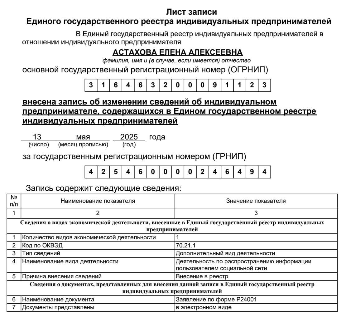 Вот такой ОКВЭД рекомендуют добавить индивидуальным предпринимателям, которые ведут свои социальные сети и делятся полезностями и своим опытом. Сходила добавила на всякий случай, он кушать не просит. Так что имейте в виду те из вас, кто меня читает, что лучше сходить добавить. Делается это через личный кабинет nalog.ru никуда ходить не надо. Важно! Если получаете доход от рекламы на своем канале помимо публикаций, нужно еще один ОКВЭД добавлять. На всякий случай, проконсультируйтесь с юристом по этому поводу, ну или с бухгалтером. P.S.: Если вдруг кто-то не знает, чтобы взаимодействовать с налоговой через сайт потребуется ЭЦП. Выпустить можно бесплатно, покупается только носитель (можно купить в пределах 2 тыс.руб.), я это делала в первый раз через поход в местную налоговую. А продляется ЭЦП также, через nalog.ru, тоже бесплатно.