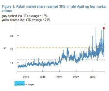 FOMO воплоти «По нашему мнению, розничные трейдеры были одним из основных драйверов рыночного ралли в последнюю неделю апреля на фоне сдержанной институциональной активности и низкого позиционирования CTA. Их доля рынка достигла 36% 28/29 апреля, самого высокого уровня в нашей истории по сравнению со средним показателем за год в 21% и долгосрочным средним показателем в 12%)» [JPM] @marketheart