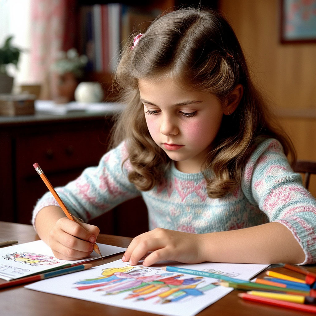 Девочка сидит за письменным столом и старательно выводит последние штрихи. Наконец, она переворачивает листок и что-то пишет.