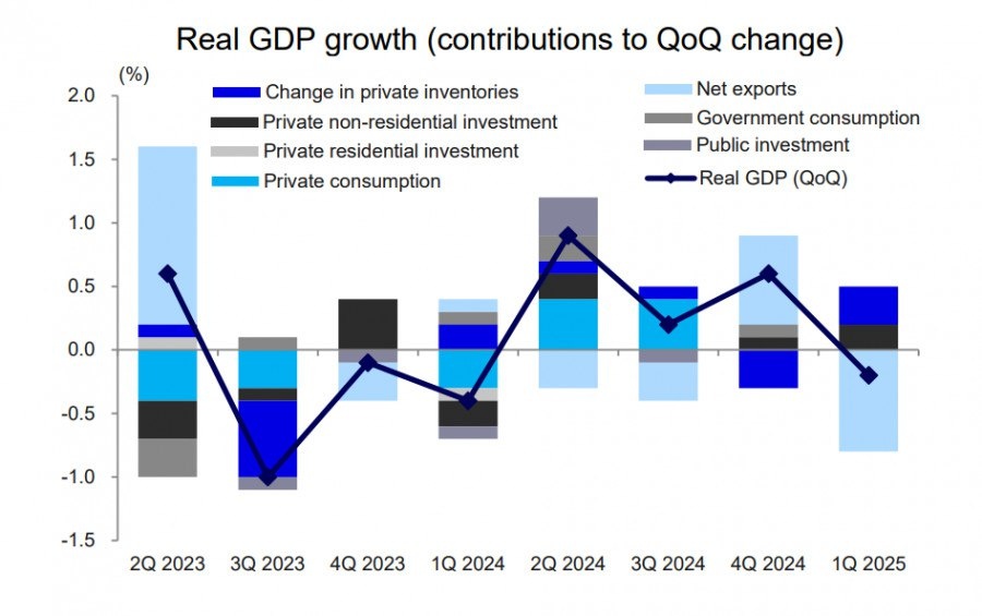 https://basechop.ru/wordpress/?p=42954 Опубликованный в четверг отчет по ВВП Японии за 1 квартал показал сокращение экономики на 0.7% г/г впервые за последний год. Сокращение оказалось заметно сильнее, чем прогнозировалось. Снижение, в первую очередь, объясняется введением торговых пошлин со стороны США и падением экспорта, но, как показал отчет, явно проявилась и стагнация частного потребления, что говорит о том, что экономика теряла поддержку зарубежного спроса еще до объявления Трампом 2 апреля о введении масштабных взаимных пошлин. Экономика Японии очень зависима от внешнего спроса, и если переговоры по пошлинам не дадут позитивного результата, то во 2 квартале падение может усилиться, что будет расценено рынками как официальное начало рецессии. Для Банка Японии ситуация, как обычно, выглядит сложной. Для восстановления потребительского спроса заметное повышение заработной платы, которого добились профсоюзы, фактор позитивный, но он же и основной фактор роста цен, то есть инфляц