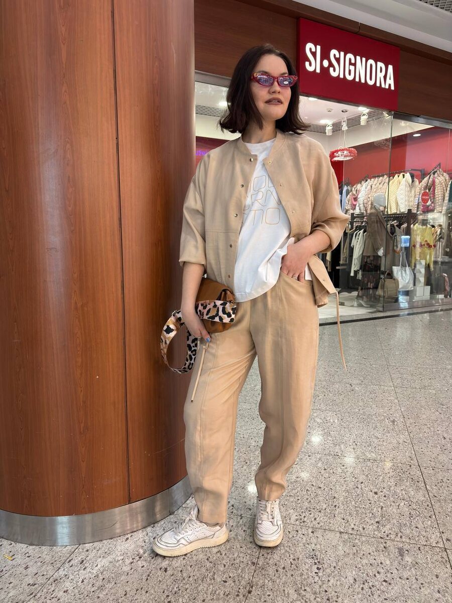 ❗️Костюм в песочном оттенке ❗️ Бомбер на кнопках, манжеты на резинке. Костюм и футболка из одной коллекции идеально сочетаются по стилю и оттенкам. Добавляем яркие детали для пущего эффекта и настроения ❗️ Размеры от 44 до 54 Костюм 15.800₽ Футболка 5.400₽ Очки 3.500₽ Сумка конверт 7.800₽