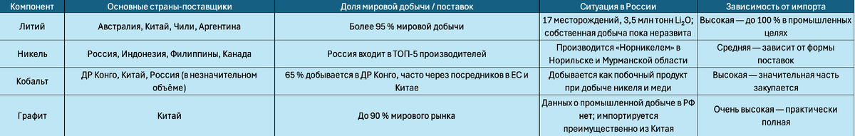Создание национальной отрасли производства ЛИА невозможно без надёжной материальной базы. Основные компоненты — материалы на основе лития, никеля, кобальта, графита — пока в значительной степени импортируются. Более 95 % мирового лития добывается в Австралии, странах Латинской Америки и Китае, причём именно оттуда сырьё поступает и на российские предприятия. В частности, в 2023 году сообщалось, что Новосибирский завод химконцентратов, «Халмеком» и Красноярский химико-металлургический завод закупали литийсодержащие материалы в Китае, Чили и Аргентине, однако после заморозки поставок из Латинской Америки был поставлен вопрос об ускоренной разработке собственных месторождений, в том числе Колмозёрского. Что касается никеля, Россия обладает собственными мощностями: его производство сосредоточено в Арктической зоне, где ведущим игроком остаётся компания «Норникель» с активами в Норильске и на Кольском полуострове. Кобальт, как правило, добывается как побочный продукт при извлечении никеля и меди, при этом до 65 % мирового объёма приходится на Демократическую Республику Конго. Поставки графита преимущественно осуществляются из Китая, что делает цепочку снабжения крайне чувствительной к внешнеполитическим ограничениям. В этих условиях локализация критически важной сырьевой базы становится не просто стратегической задачей, а фактором обеспечения национальной безопасности и промышленной устойчивости.