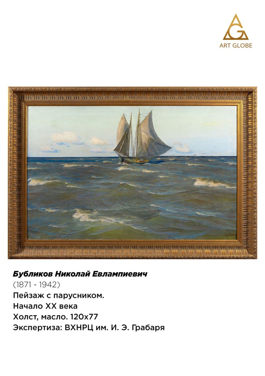 Топ-лотом нового аукциона на Art Globe стала роскошная коллекционная работа Николая Бубликова (1871 - 1942) Бубликов Николай Евлампиевич (1871 - 1942) Пейзаж с парусником. Начало XX века Холст, масло. 120x77 Экспертиза: ВХНРЦ им. И. Э. Грабаря На этом полотне Николая Евлампиевича Бубликова — «Пейзаж с парусником» (холст, масло, 120 × 77 см, нач. XX в.) — море звучит, как тщательно настроенный инструмент. Плеск холодной ультрамариновой подложки отзывается тёплым охристым бликом на борту судна, а капризный ветер, взлохмачивающий валуны воды, неожиданно срывается с парусов — и словно переносит зрителя в зону живого присутствия. Художник, воспитанник Ивана Шишкина и Архипа Куинджи, соединяет академическую форму со световой драмой своего романтического наставника: мы различаем «анатомию» каждой волны, но одновременно ощущаем метафизику пространства, куда без остатка уходит наш взор. Горизонт Бубликов нарочно опускает низко, почти «куинджиевски», так что море занимает две трети полотна и