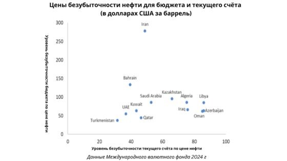 В настоящий момент зоной безубыточности для бюджетов и платежных балансов государств-экспортеров нефти являются цены в диапазоне $40–90 за баррель. Приведенный ниже график иллюстрирует, при какой стоимости «черного золота» они могут избежать убытков. По вертикальной оси показана фискальная безубыточность — цена на нефть, при которой государственный бюджет сбалансирован и не требует внешнего или внутреннего заимствования. По горизонтальной оси — внешняя (или текущая) безубыточность: она отражает цену, необходимую для нулевого сальдо текущего счёта платёжного баланса, то есть когда экспорт и импорт товаров, услуг и текущих трансфертов находятся в равновесии.