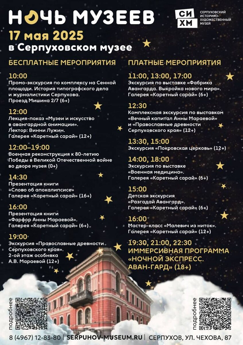 ✨ Ночь музеев в Историко-художественном 😉 😉Будет много нового! Есть бесплатные программы, а есть платные Начнём мы в этот день с 10:00 утра, а закончим поздно вечером 🌛 🔹 Первая экскурсия в комплексе на Сенной площади (бывший Музей Печати) 🔹 Лекция "Музеи и искусство в авангардной анимации" 🔹 Презентация книги "Фарфор Анны Мараевой" 🔹 Иммерсивный вечер "Ночной экспресс. Аван-гард" 👉И все это только часть обширной программы! 🎟️Заходите по ссылке, приобретайте бесплатные или платные билеты 📆 17.05.2025 🕒 10:00 🏢 Серпуховский историко-художественный музей 📍 Московская обл., г. Серпухов, ул. Чехова, д. 87 🎫 Купить билет: https://clck.ru/3Lhg5K #webСерпухов ✅ Мероприятия Серпухов https://dzen.ru/id/66f01c6eb4c6fe60c9ca1608 http://vk.com/serpukhov_events http://dzen.ru/serpukhov_events