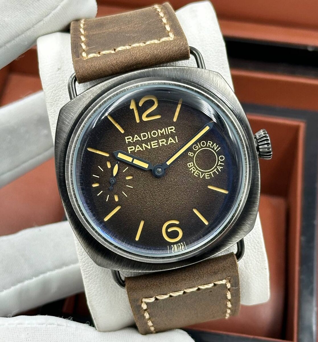 🤎Мужские наручные часы — Panerai — Radiomir Otto Giorni (8403) Ref: PAM01347 ➖Корпус: Полированная часовая сталь 316L, с PVD покрытием; ➖Ремешок: Коричневый кожаный ремешок 26/22мм, с классической пряжкой; ➖Циферблат: Матово-коричневый, со светящимися арабскими цифрами и часовыми метками; ➖Стекло: Синтетический сапфир с антибликом; ➖Механизм: Механика с ручным заводом (Япония), 21.600 п.к/час; ➖Водозащита: WR-30 - бытовая; ➖Функции: Часы, минуты, секунды; ➖Размеры: 45х16 мм.; ➖Комплектация товара:Транспортировочная шкатулка; 16.300 ₽ @Replicano_org / @operator_replicano ________________________________ #Механическиечасы #Мужскиечасы #Panerai