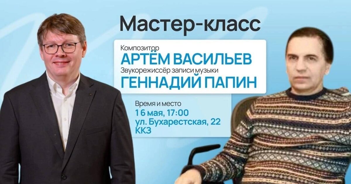 💥Мастер-класс «Музыка спасёт нас!» (цитата из ф. Ф. Феллини: «Репетиция оркестра») Продолжаются мастер-классы от XI Международного кинофестиваля студенческих работ звукорежиссёров «INтонации»!! Как создаётся та самая музыка к фильму, которая «спасёт нас», вы сможете узнать на мастер-классе настоящих профессионалов своего дела — композитора Артёма Васильева и звукорежиссёра записи музыки Геннадия Папина! 📅 Дата: 16 мая ⏰ Время: с 17:00 до 19:00 📍 Место: ул. Бухарестская, 22, киноконцертный зал 🎤 Артём Васильев — композитор и доктор искусствоведения, доцент Московской государственной консерватории им. П.И. Чайковского. Он — автор музыки к более чем 40 фильмам, среди которых «София» и «Годунов», неоднократный лауреат и номинант премий: «Золотой орёл», «Золотая маска», АПКИТ, «Икар» и многих других 🎤 Геннадий Папин — ведущий звукорежиссёр киностудии «Мосфильм», обладающий богатым опытом записи музыки в самых разных жанрах. Его сотрудничество с именитыми композиторами позволило со