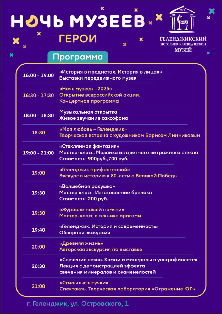 Напоминаем, что уже в субботу, 17 мая, Геленджик присоединится к всероссийской акции «Ночь музеев». В этом году историко-краеведческий музей приготовил насыщенную программу, где история, искусство и наука сливаются воедино. - 16:30 — открытие, концертная программа у входа в музей; - 18:00 — магия саксофона: живые мелодии под открытым небом; - 18:30 — встреча с известным художником Борисом Линниковым; - 19:00 — экскурс в историю «Геленджик прифронтовой»; - 19:40 — обзорная экскурсия; - 20:00 — авторский тур по выставке «Древняя жизнь»; - 20:30 — лекция-диалог о минералах и окаменелостях; - 21:00 — спектакль от творческой лаборатории «Отражение Юг». С 18:00 до 23:00 вход в музей — бесплатный. Адрес: ул. Островского, 1. Приходите всей семьей, чтобы провести вечер среди артефактов, музыки и вдохновения.