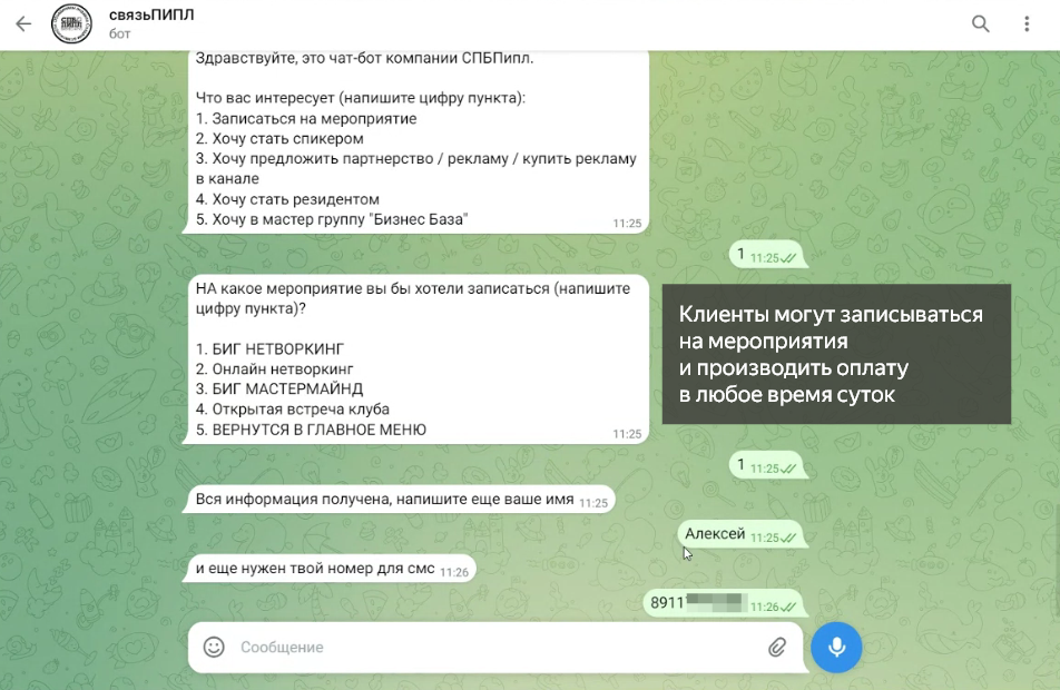 К нам обратился бизнес-клуб с целью автоматизации процесса регистрации на мероприятия, выбора мероприятий и оплаты с помощью чат-бота 🤖 До автоматизации бизнес-клуб сталкивался с рядом серьезных проблем, которые негативно сказывались на качестве обслуживания клиентов и эффективности работы команды: Для решения данных проблем был разработан чат-бот с целью автоматизации процессов бизнес-клуба 😎 Чат-бот включает себя следующий функционал: 1. Выбор мероприятий: клиенты могут легко просматривать доступные мероприятия и выбирать интересующие их события. 2. Запись на мероприятия: чат-бот позволяет записываться на мероприятия, вводя номер телефона и другие необходимые данные. 3. Отправка ссылок на оплату: после записи чат-бот автоматически отправляет ссылку на оплату через сервис смс-рассылок 🚀 4. Хранение данных в CRM: все данные о клиентах и их заказах хранятся в CRM-системе, что обеспечивает доступ к информации в любое время. 5. Отслеживание статусов: статусы заказов автоматически об