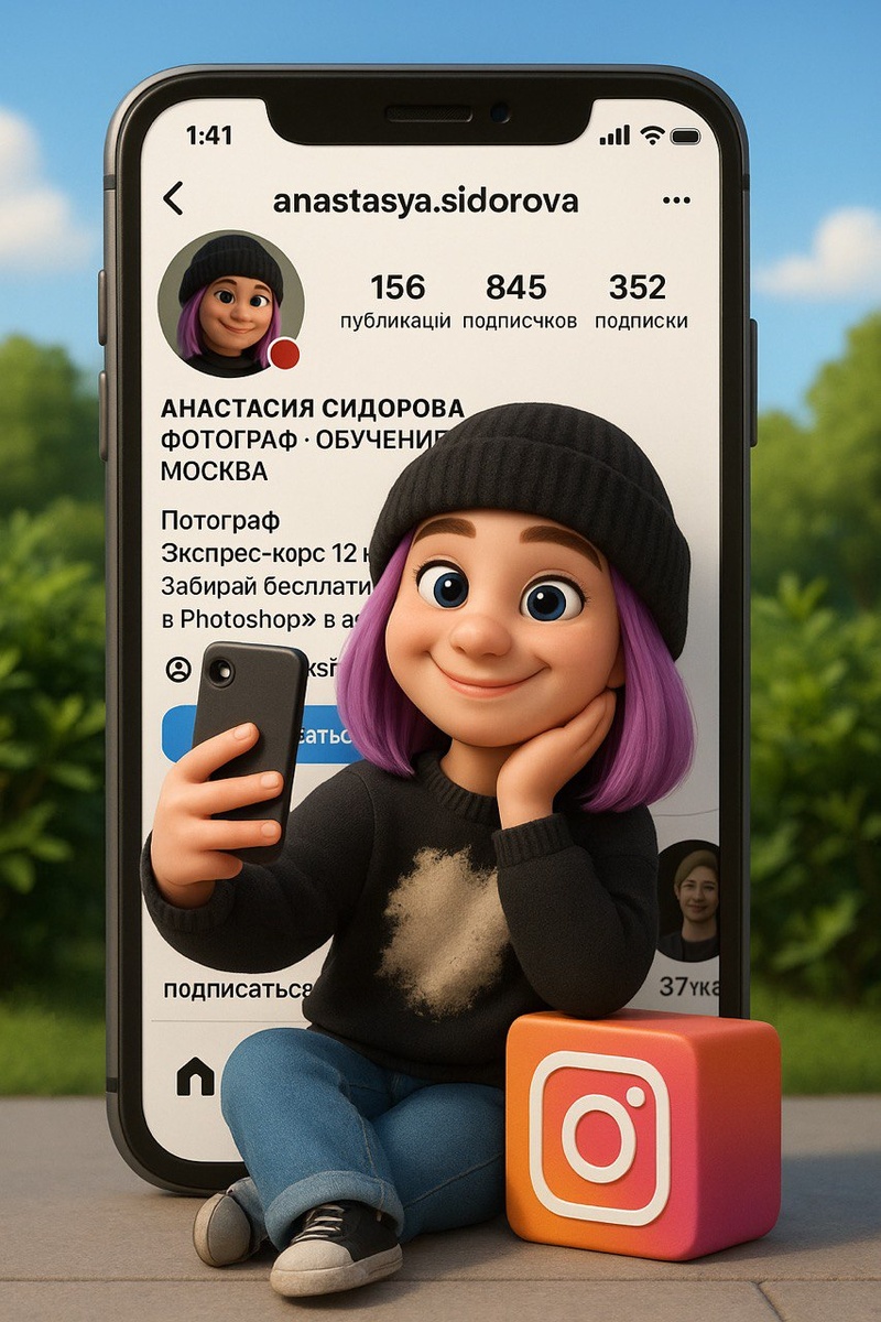 Я считаю, это наимилейший тренд😍 не без факапов, конечно, но это поправимо, а может и не принципиально😅 промт: создай 3d-иллюстрацию в стиле мульта Pixar. Изобрази меня (фото1) как милого мультяшного персонажа, сидящего перед огромным экраном смартфона, на котором открыт мой Instagram-профиль. я держу в руке телефон и делаю селфи, улыбаюсь. На фоне за мной - увеличенный экран смартфона с моим профилем instagram (фото 2): на белом фоне видно аватарку, количество постов, подписчиков и подписок. Я сижу на ярком кубе с логотипом instagram. Сохрани прическу, одежду и цвет волос с приложенного фото. Фон - на улице, дневной свет, зеленые растения на заднем плане.