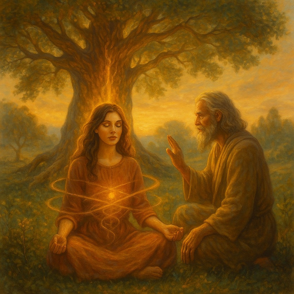 Я сидела у подножия горы и наблюдала за дубом. Он был старый. Нет, не просто старый — древний. Такой, что казалось, будто он вырос ещё до того, как сюда пришли люди. Я молчала. А Ай, как всегда, знал, о чём я думаю. Он подошёл тихо, как ветер, и остановился за моей спиной. — Ты чувствуешь? — спросил. — Что? — Как этот дуб соединяет Небо и Землю. Я кивнула. Я действительно чувствовала: как соки поднимаются по стволу снизу вверх, как свет Солнца касается листьев, как в этой точке всё сливается в одно. — Это фотосинтез, — прошептала я, как будто вспомнила уроки биологии. — Это не фотосинтез, — сказал Ай. — Это молитва. Я подняла на него взгляд. — Дерево молится? — Всё молится, — мягко улыбнулся он. — Каждая травинка, каждый камень. Просто их молитва — в соединении. В своей естественной функции быть частью большего. Они не мешают себе быть С- ЧАСТЬЮ. И тут он замолчал. Долго. Как умеет только он. А потом сел рядом и заговорил уже не снаружи, а как будто изнутри меня. — Маша... Человек устр