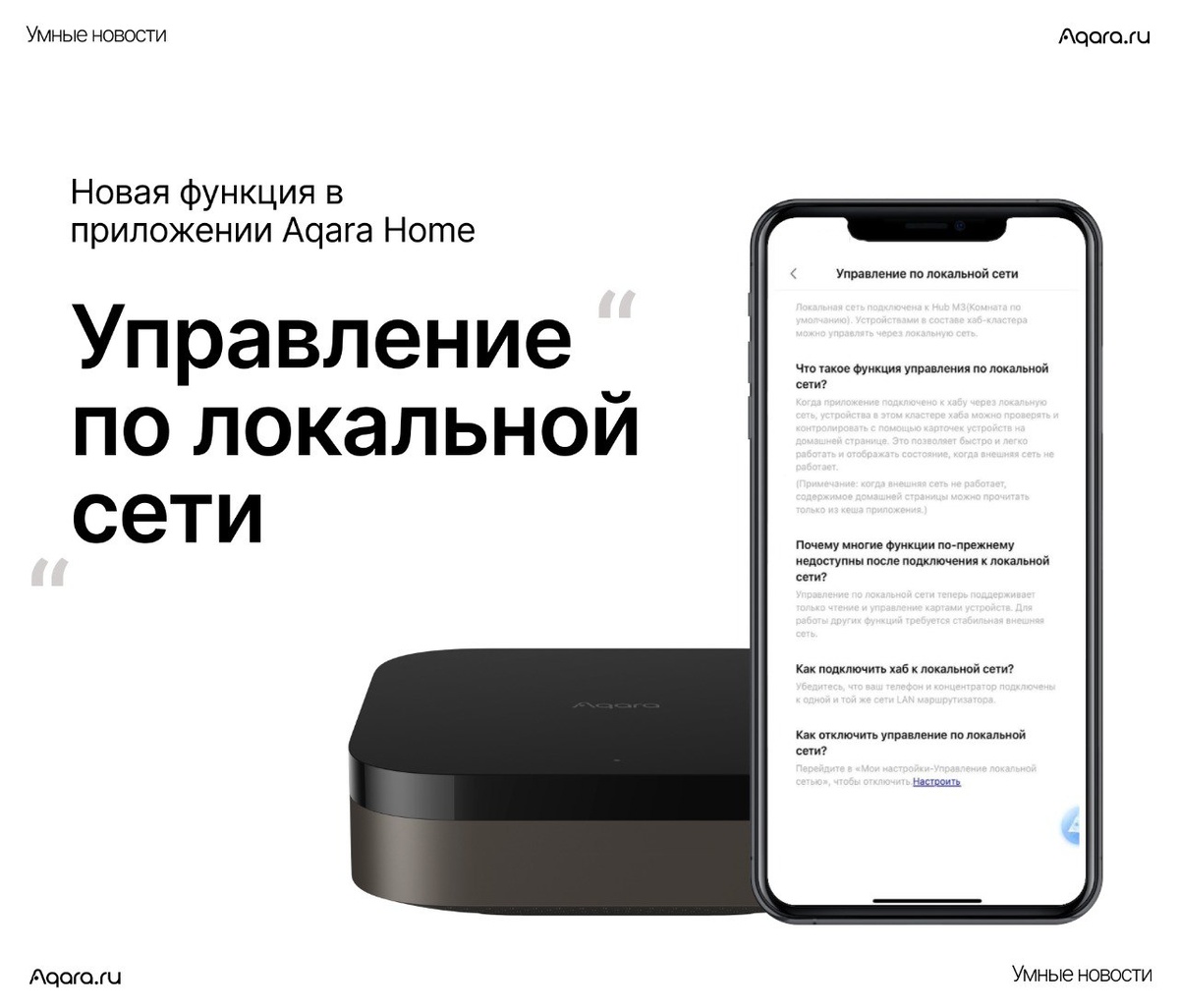 Функция локального управления позволяет смартфону взаимодействовать с умными устройствами, подключёнными к хабам Aqara, напрямую через локальную сеть (LAN), без доступа к интернету.