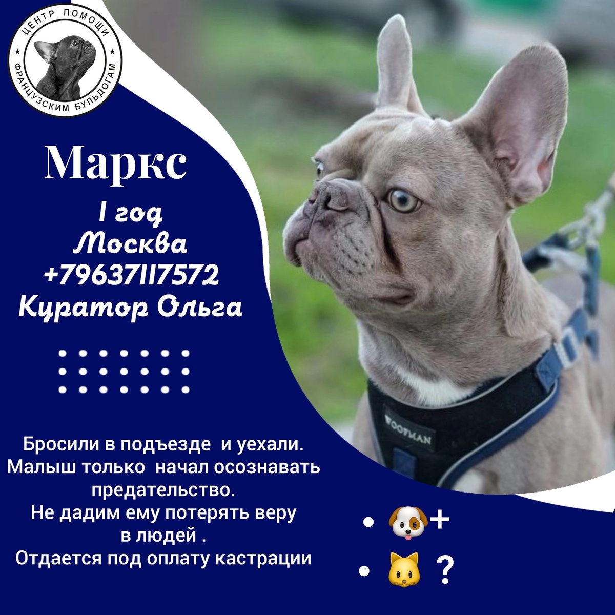 💎Та-даамс! Молодой голубой здоровый красавец . Я не знаю, что случилось с его хозяевами, но Маркс несколько дней бегал бесхозным в ЖК, где проживал . Приютили, попросили пристроить . 💎Что мы имеем на данный момент : #Маркс@frenchbull_help 📀 Обследован и обработан 📀стерилизован 📀дружит с другими собаками , весело играет 📀юркой, вертлявый, игручий, людей любит 📀сидит в ветклинике на юге Москвы и ждёт новую семью 📀вет. счет тикает , просим помочь красавцу . 💎Смотрите его отчет , https://vk.com/topic-144285450_54176492 💎заполняйте анкету 💎пишите на вотсап проводнику в мир счастья: куратор Ольга Сетина тел. 8963 711 7572 Реквизиты группы: ⭕Все карты привязаны к номеру телефона +79162965030 Мусатова Марина Леонидовна ☆ Карта Тинькофф Карта 5536 9138 7565 3962 ☆ Карта Совкомбанк . Карта 2200 2711 2170 8185 ☆ Карта Авангард Карта 2200 2302 0817 0487 🌹Спасибо всем , кто понимает, помогает и поддерживает. Без вас мы бы не справились 🌹