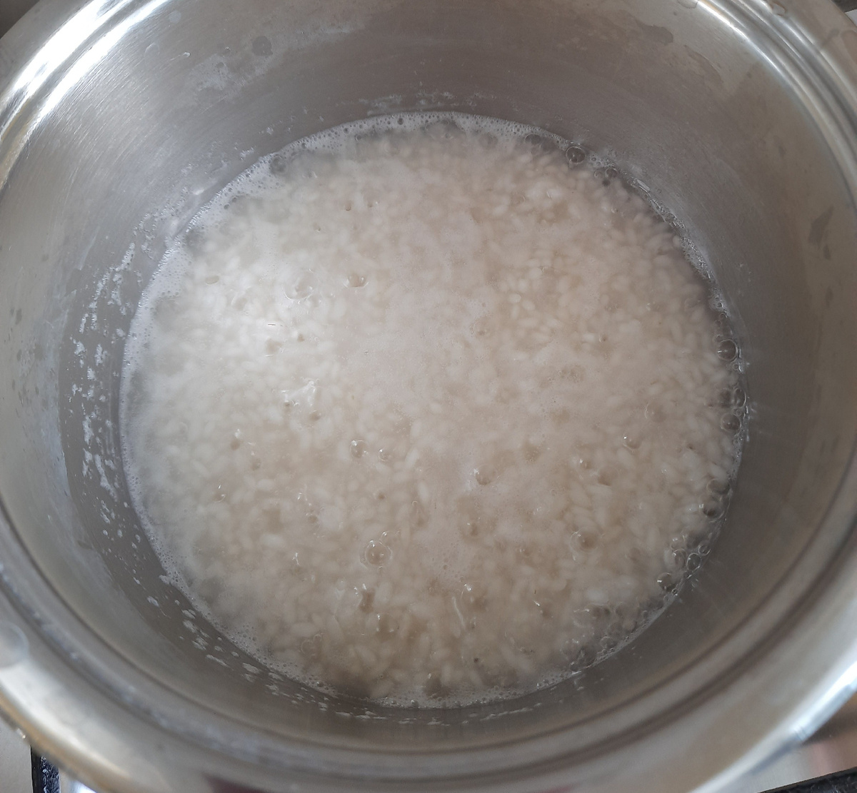 Я когда увидела этот рецепт, почему-то сразу вспомнила очень вкусную кашу, которую пробовала в кафе Ранние пташки в Перми. Статья тут: Я не любитель каш, ем их очень редко. И в детстве почти их не ела. Поэтому люблю пробовать в кафе. Там подача красивая, сочетания бывают интересные. Та каша была волшебной. Каждая рисинка как будто в сочной маслянистой мантии. Меня это очень удивило, потому что я такую никогда не пробовала. А оказывается это классический рецепт, который раньше в садиках подавали. В оригинале пропорции такие: круглозерный рис 222г, вода 490 мл, молоко 333 мл, соль щепочка, сахар 30г. Я взяла всего, кроме сахара, ровно в половину меньше, рис 111г, вода 245г, молоко 166г. А сахар оставила 25г. Уж не знаю, как там это все замеряли в СССР. Скорее всего, просто стаканами отмеряли. Но в рецепте было именно по граммам. Этапы. Сначала ставим кипятиться воду, промываем рис, добавляем сахар и соль. Варим 14 минут. У меня вышло чуть меньше, минут 10. Потому что и пропорции меньше.