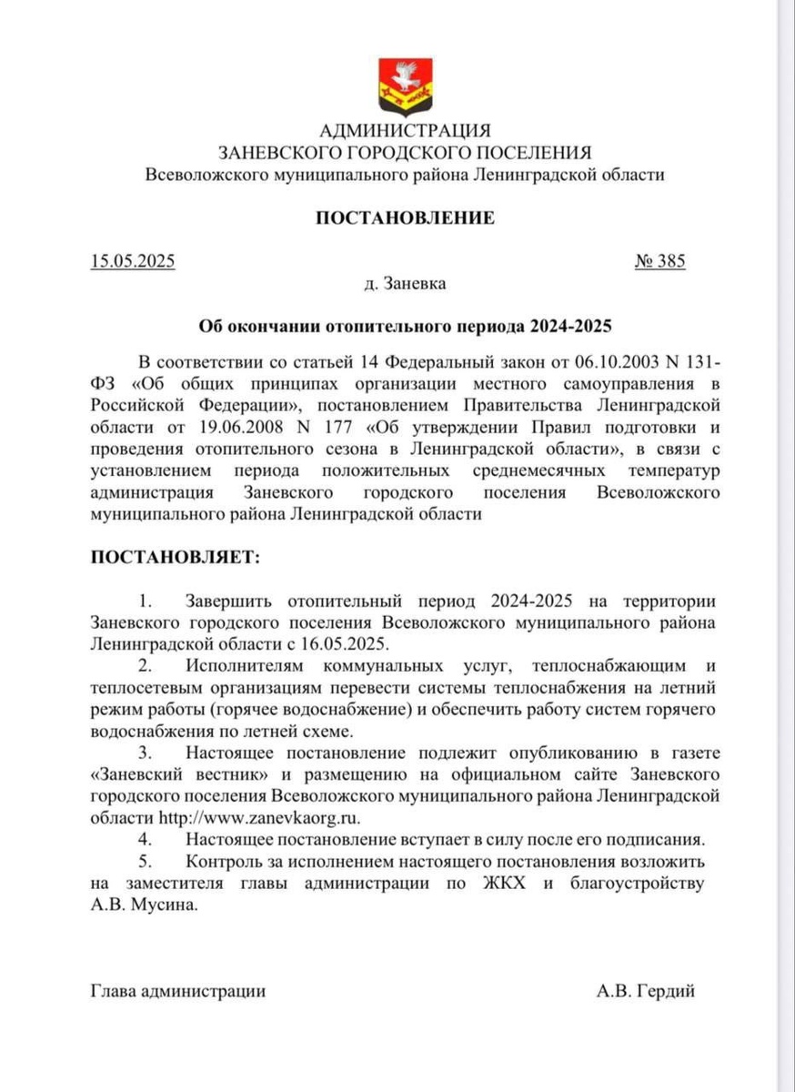В Заневском поселении заканчивается отопительный сезон Батареи отключат уже сегодня. С 16 мая исполнителям коммунальных услуг, теплосетевым и теплоснабжающим организациям предписано перевести системы на летний режим работы и обеспечить горячее водоснабжение по соответствующей схеме. Постановление подписано главой администрации Алексеем Гердием. Отметим, на фоне потепления в регионе и поступавших жалоб жителей на излишне высокую температуру в квартирах, с 18 апреля муниципалитет уже перешел на периодическое протапливание. Это позволило поддерживать оптимальный диапазон прогрева домов до завершения сезона. Заневское городское поселение ДТП и ЧП Кудрово