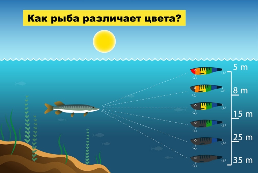 Свет распространяется под водой иначе , нежели в воздухе. Основополагающим выводом из исследований по поглощению света в воде было то , что с увеличением глубины первым поглощается красный , оранжевый , желтый , зеленый и последним синий цвет. Наиболее яркие цвета в ультрафиолетовом свете очень хороши для ловли на больших глубинах.В прозрачной воде синий и фиолетовый цвета проникают очень глубоко в толщу воды , а их флуоресценция , делает эти цвета отлично видными под водой. Обычные цвета отражают свет только с определенной длинной волны , флуоресцентные же цвета светятся очень ярко если на них падает обычный свет и кажется , в большинстве случаев , при одинаковом освещении под водой , флуоресцентные цвета обладают лучшей видимостью нежели обычные. Так например на больших глубинах и в мутной воде , лучше всего использовать приманки с флуоресцентными расцветками. Имейте в виду , что в воде содержится большое количество частиц , которые оказывают влияние на поглощение света в