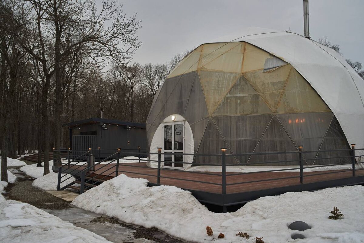 «Рыбный филин» на Заимке — пространство, в котором хочется задержаться. Купольная архитектура посреди леса, живой огонь в центре зала, бар с тёплым светом, текстурами дерева и мягкой посадкой. А над всем этим — кит. Настоящий арт-объект, символ погружения в атмосферу: спокойную, глубокую, обволакивающую. Мы создавали это пространство как укрытие от суеты. Здесь хочется замедлиться, согреться, почувствовать, как исчезают шумы внешнего мира. Magenta.