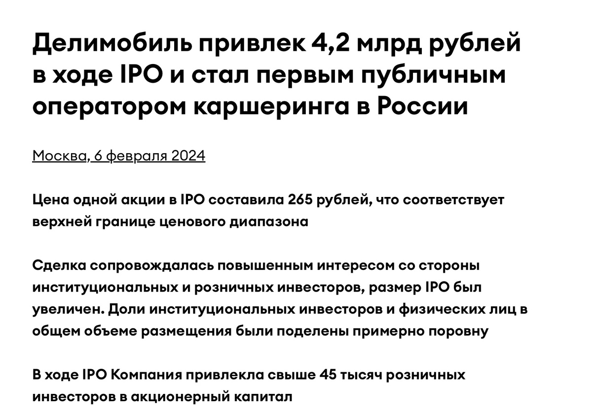15 мая 2025 года прошло годовое отчетное собрание акционеров ПАО «Каршеринг Руссия» (Делимобиль) . Если для крупных компаний государство оставило много лазеек для непроведения очных годовых собраний акционеров, чем они успешно и воспользовались, то небольшие и средние обязаны очно встречаться со своими акционерами. А таких компания после «бума IPO” 2023-2024 годов стало больше на Московской Бирже. Одна из них - ПАО «Каршеринг Руссия» (Делимобиль) , более известная под торговой маркой Делимобиль. Компания провела IPO чуть более года назад по верхней цене диапазона в 265 руб. Спрос был повышенный, что позволило увеличить объем предлагаемых акций. В итоге миноритарным акционерам досталось 9% капитала. Все деньги от допэмиссии пошли на развитие компании. Но после кратковременного роста акции компании начали снижаться и теперь торгуются на 40% ниже цены размещения. В таких условиях менеджмент провел свое первое очное ГОСА. Собрание проводилось в конференц-зале гостиницы Swishotel Красные хо