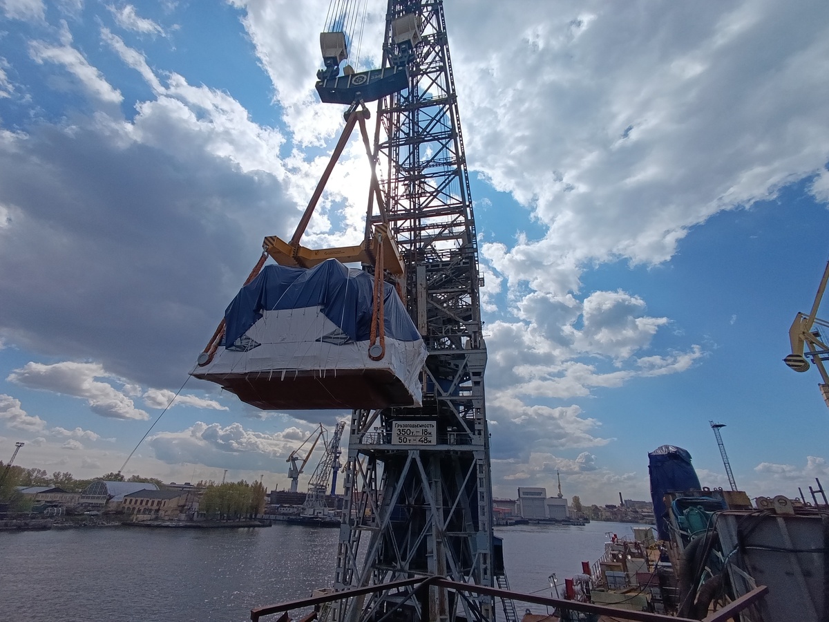 При помощи плавучего крана и специальной оснастки специалисты предприятия установили на штатное место агрегат весом порядка 300 тонн и мощностью 20 МВт. Начался процесс его монтажа. Фото: «Балтийский завод». Это второй двигатель, установленный на судне: ГЭД левого борта погрузили в ноябре 2024 года. Всего на ледокол установят три гребных электродвигателя – два по бортам и один в центре. Они обеспечат движение и маневренность «Чукотки» во время эксплуатации. Атомный ледокол «Чукотка» – пятое судно проекта 22220, которое строится на Балтийском заводе по заказу госкорпорации «Росатом». На воду его спустили в ноябре 2024 года. В настоящее время на судне продолжаются достроечные работы – формируется надстройка, в которой разместятся ходовая рубка, пост связи, каюты, другие помещения и оборудование, необходимое для обеспечения управления и безопасности навигации.