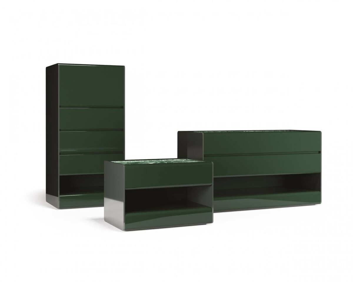 Современная конструкция с чёткими линиями дополнена мраморной столешницей, придающей предметам роскошь и основательность. Окрашенные боковины из алюминия и корпус из МДФ с матовым или глянцевым лаком создают ощущение лёгкости, а парящие объёмы между основанием и верхом придают композиции динамику и утонченную визуальную лёгкость.