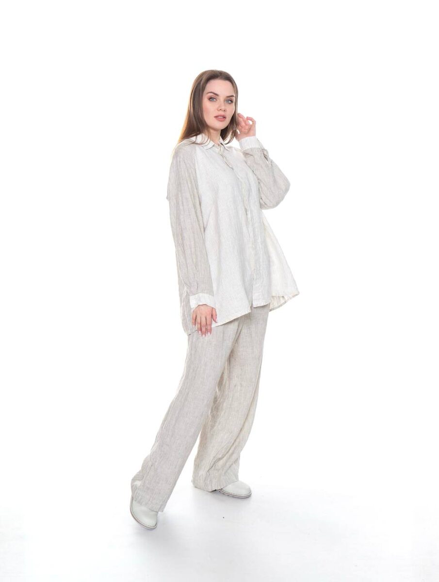Образ, в котором сочетаются архитектурный крой, сложные оттенки и актуальная фактура. ⠀ В центре композиции — свободная рубашка в стилистике color-block. Передняя часть, воротник и манжеты выполнены в нежно-бежевом оттенке с тонкой вертикальной полоской — сдержанно, но с характером. Удлинённая спинка и рукава создают интересный эффект и выполнены в серо-бежевых тонах, что добавляет глубины и визуального контраста. Благодаря продуманному силуэту, рубашка мягко струится и идеально садится по фигуре. ⠀ В образ органично вписаны широкие брюки прямого кроя, выполненные в том же сложном серо-бежевом оттенке. Линия брюк подчёркивает расслабленную элегантность и создает единое цветовое поле, в котором каждая деталь работает на образ в целом. ⠀ Идеальное решение для тех, кто ценит интеллектуальный стиль, комфорт и утончённую простоту. Для оптового сотрудничества пишите нам: 📲-в директ 📲-по номеру 8 800 511 51 95 📲- +7 495 146-92-72 📲Наш сайт — https://sollery.pro ✉️-на почту info@sollery.f