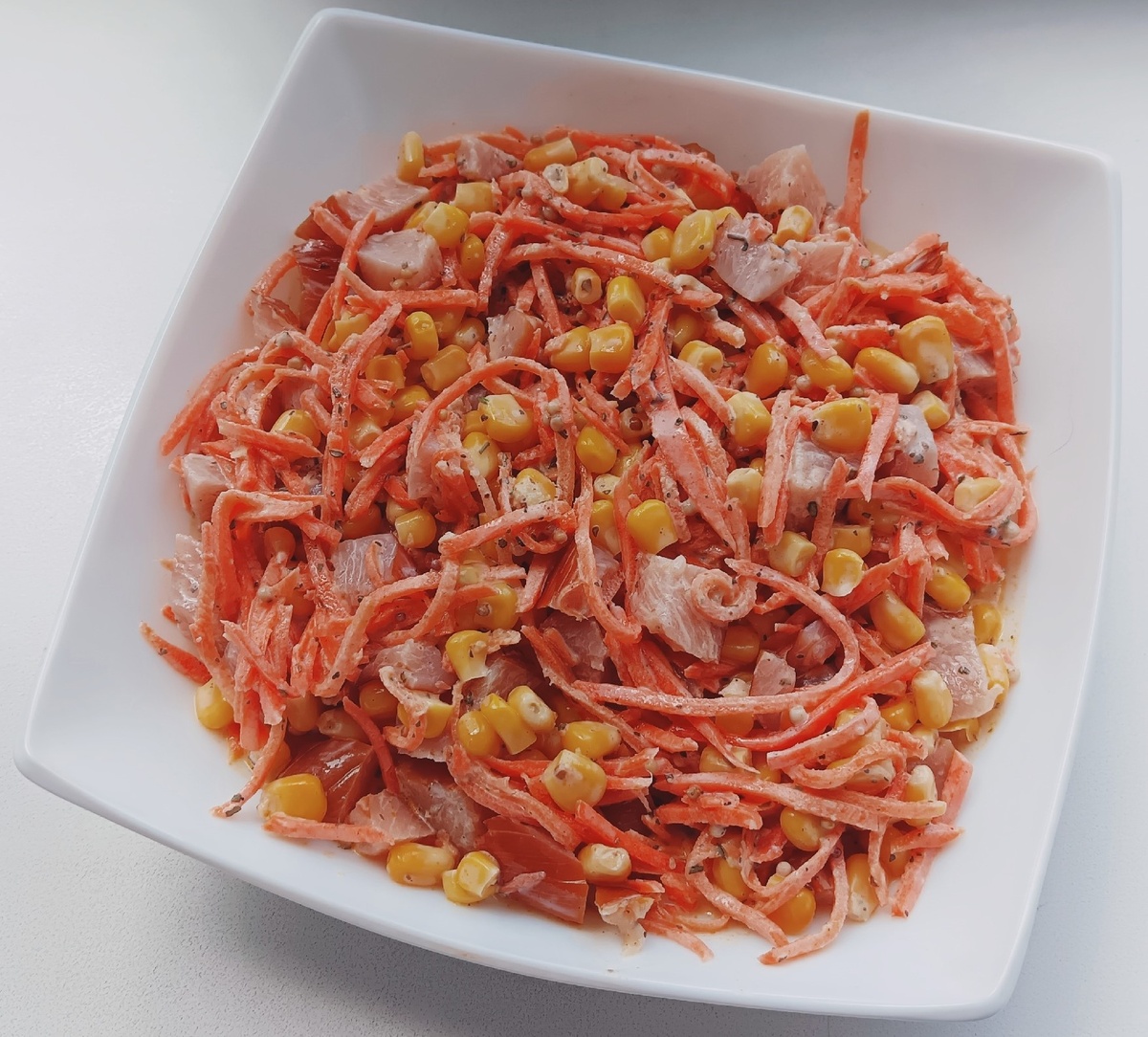 Куриная грудка с морковью по-корейски в дополнении с кукурузой - лучшее сочетание для салата я считаю.