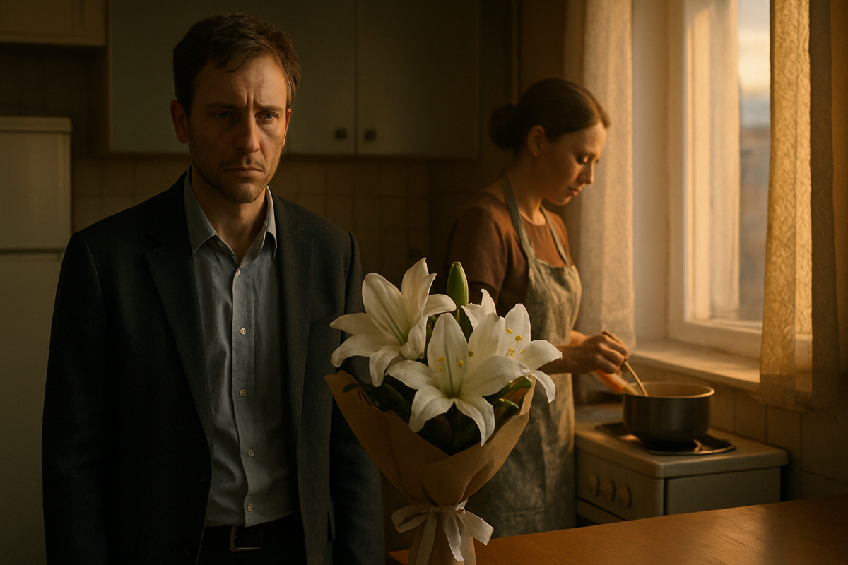 Маленькая квартира в панельном доме медленно наполнялась вечерним светом — жёлтым, тусклым, как и обыденность, ставшая фоном их брака. Солнце уходило за дома, и тени начинали прятаться по углам, растекаясь по полу, как влага в трещинах. Антон пришёл с работы позже обычного — уставший, с рассеянным взглядом, будто его мысли застряли где-то в пробке, вместе с ветром, дымом и усталостью мегаполиса. Он сразу заметил букет на кухонном столе: белые лилии в обёртке, перевязанной серебристой лентой. Свежие, дорогие, такие, каких он никогда не дарил. — Это что? — спросил он, снимая пиджак и бросая его на спинку стула. Мария стояла у плиты, в фартуке с выцветшими цветами, и помешивала соус в маленькой кастрюле. Она улыбнулась, не отрывая взгляда от кипящего. — Прислали. Без подписи. Он подошёл ближе, склонился над букетом. Запах сладкий, густой, навязчивый. Цветы были идеальны, словно только с витрины. — Ты думаешь, это я? — усмехнулся он, с горечью в голосе. — Ну... — она пожала плечами, быстро